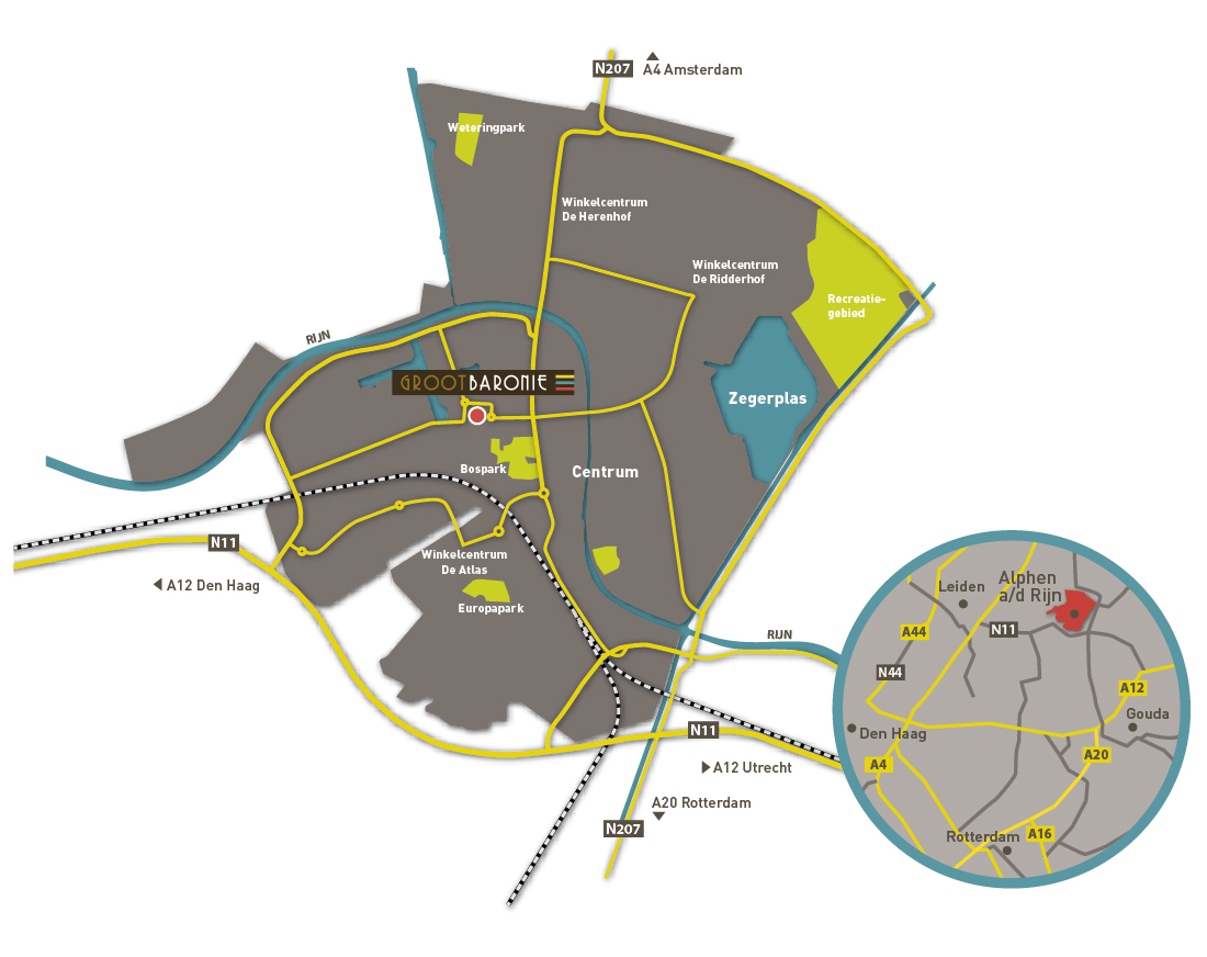 De bedrijfs- en kantoorruimten op de verdiepingen worden ontsloten met de twee oorspronkelijke trappenhuizen en liften. De hogere verdiepingen bieden een panoramisch uitzicht over het gebied Groot Baronie, de haven en het centrum van Alphen aan den Rijn. Daarnaast is er dankzij de mogelijkheden voor werken, winkelen en wonen altijd bedrijvigheid in en om deze nostalgische omgeving. De optimale aansluiting met hoofdwegen N11 en N207 maken Groot Baronie goed bereikbaar. Betere parkeermogelijkheden zijn bovendien nabij het centrum van Alphen aan den Rijn niet te vinden. De Baronie beschikt over eigen parkeerdekken met 444 parkeerplaatsen. De eerste 1,5 uur parkeren is daarbij gratis!